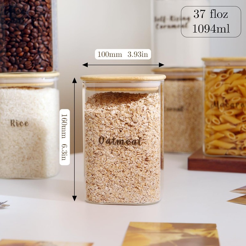 • 【BEAUTIFUL GIFT FOR ANYONE】6 pcs square glass food storage containers with lids are great, but with minimalist black labels preprinted they’re even better! So remember them as a mother’s day gift or housewarming gift for someone who loves kitchen organization and storage, too. Order your set of 1 set glass jars with bamboo lid and labels, now.