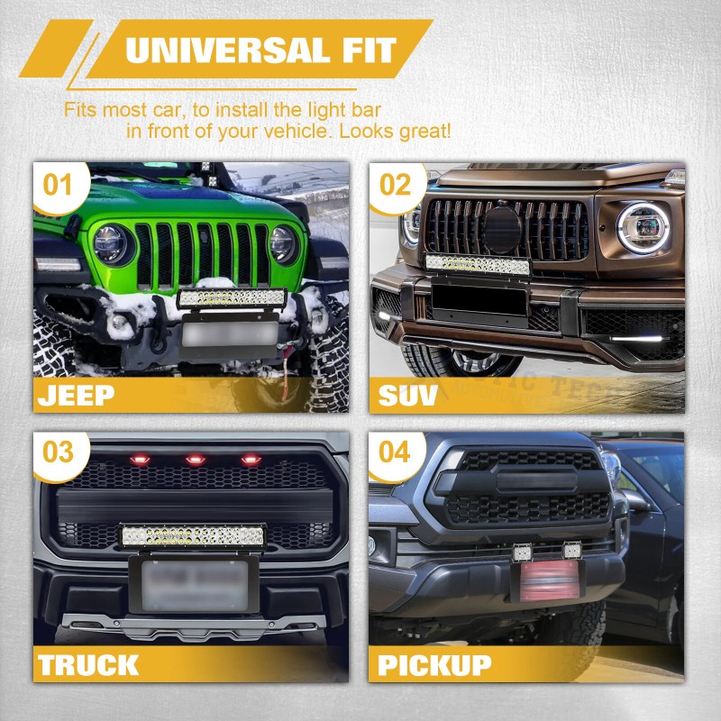 • Universal fit most trucks, pickups, SUV, Jeep, 4x4, cars with front license plate holes.