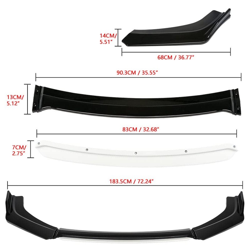 - Before buying, please measure the size of the front bumper and check your cars inner mudguard fender to make sure there is space to install (drilling) the front bumper splitter. (As a reference, 70.9" bumper width can fit). Note that the following cases are not applicable: if the original car have a front lip installed, the bottom of the front bumper is not flat enough or the front is too sharp.