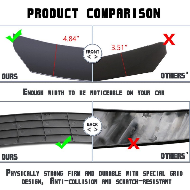 - Compatibility: Universal fit most vehicle. Please measure and check the position you are going to install the spoiler, and make sure these splitters will fit your vehicle before purchase.