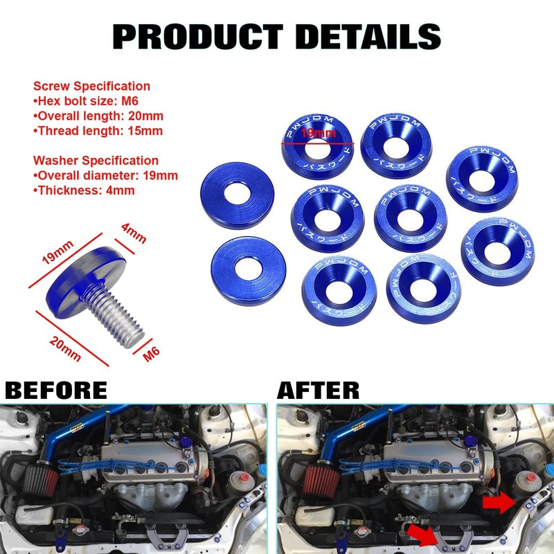 - Function:Stand out your vehicle engine bay and exterior look to an more eye-catching and racing sporty one, meanwhile, make it easier to find when installing and dismounting.