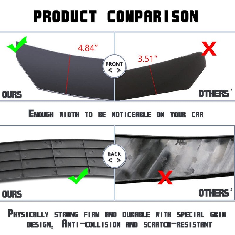 • [Model] - Universal fitment for most vehicle front bumper lip.(Please measure and check the position you are going to install the spoiler, and make sure these splitters will fit your vehicle before purchase.)