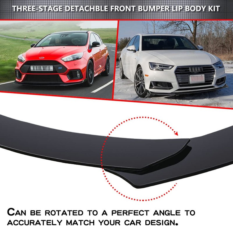 This listing features on 1 set of Front Bumper Lip Chin Spoiler Guard Body Kits (3pcs) 【Material】Made of updated durable and sturdy ABS, no deformation in long-term use 【Design】Special Grid Design on the back of the front spoiler, physically strong firm and durable, anti-collision and scratch-resistant 【Premium Quality】Exquisite Paint through strict quality control standards to build and test Perfectly decorate your dear car and give your car a more aggressive and racing appearance in a minute Provide an elegant and personalized appearance, provide anti-collision protective experience to your original bumper, protect from scrapes from driveways, speed bumps and curbs, alleviate the damage Specification 100% brand new, shown as pictured Material: Premium quality ABS Stereoscopic design, fluid curve surface No block to the front ground clearance, effectively enhance the side extension It can give your car a very sporty looking in minutes It is durable and long lasting during any weather situation It can also protect your vehicle from scratches or small bump damages Package Included 3 x Front Bumper Lip Spoiler 1 x Hardware Package Note Please measure the position you are going to install the package, and make sure these splitters will fit your vehicle before purchase Professional installation is highly recommended Product may require drilling holes and use the screws to permanently secure