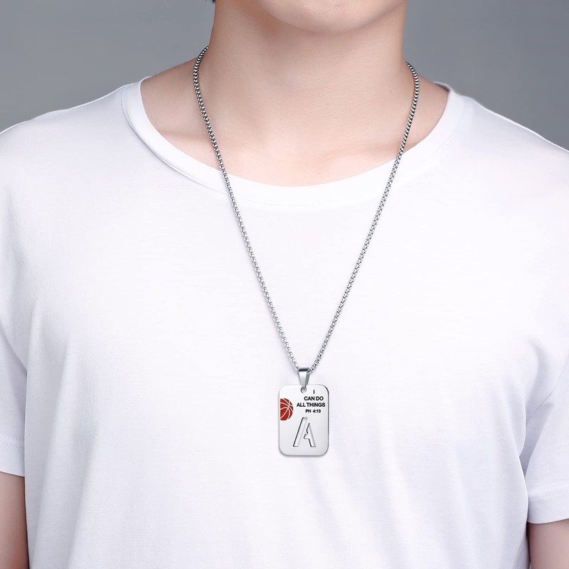 XOYOYZU Basketball Necklace for Men Initial Letter Pendant Necklace Bible Verse I CAN DO All Things Stainless Steel Sport Jewelry for Men 13