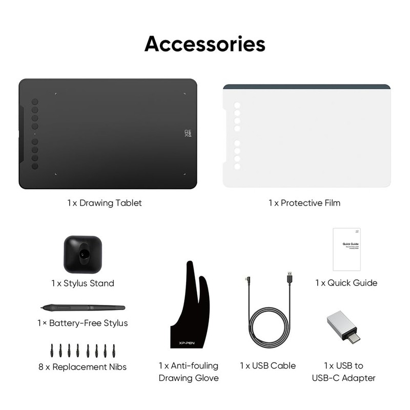 • Included Accessories: Your purchase includes: 1 x Deco 01 V3 Drawing Tablet, 1 x Stylus, 10 x Nibs, 1 x Stylus Stand, 1 x Glove, 1 x Protective Film, 1 x USB-C to USB-A Cable, 1 x USB to USB-C Adapter