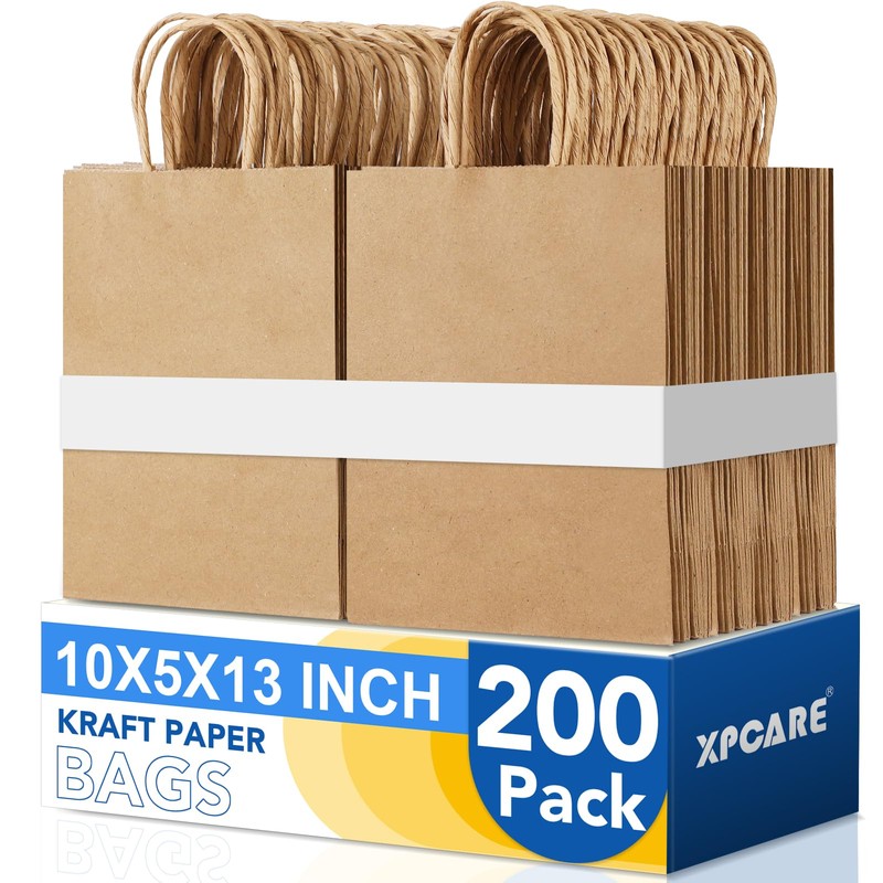 XPCARE Brown Paper Bags, 200 Packs 10x5x13 Inch Gift Bags with Handles Bulk Brown Paper Bags with Handles Retail Kraft Paper Bags Brown Gift Bags for Wedding Party Shopping