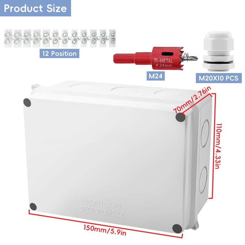 - Product parameters: the product is 150 mm/5.9 inches long, 110 mm/4.33 inches wide and 70 mm/2.76 inches high. It comes with ten m20 cable connectors, a 12-pin clamp and a M20 hole opener. You save yourself searching and buying accessories. With the hole opener, you can open holes without restrictions, which makes the installation of the junction box easier and more comfortable. It is a practical set.