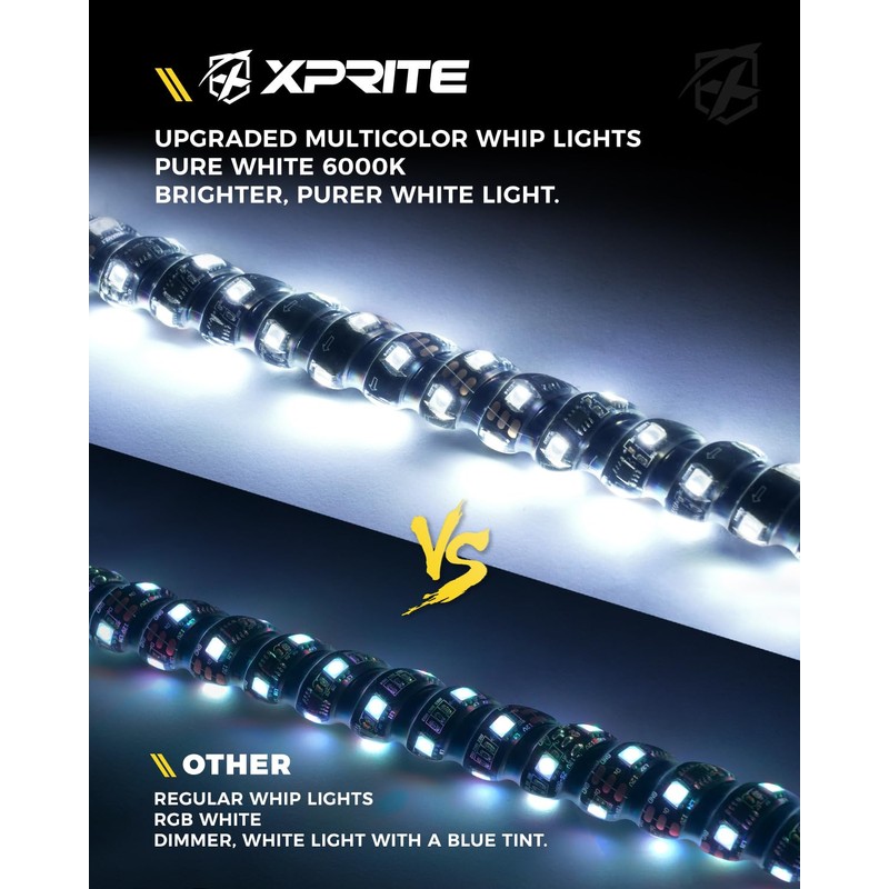 - RGBW Pure White Brilliance: LED whip lights have a unique 6000K pure white light, which can present more delicate color transitions and a wider color gamut. RGBW whip lights for side by side can effectively reduce the loss of chips in pure white light mode and extend the overall life. RGBW lighted whips are 2 times brighter than standard ATV whip lights, allowing you to stand out on the trail with brighter and purer light during night driving or challenging conditions.