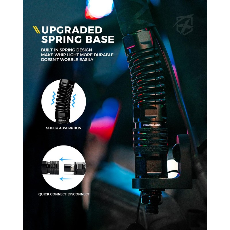 - Upgraded Integrated Spring Base: The whip lights side by side is equipped with a reinforced integrated spring base, and the 360° rotation buffer design can reduce 92% of the lateral impact of the LED whip, making the UTV whip lights have excellent wind resistance and shock resistance to reduce the risk of base breakage. The unique design can better prevent dust and rain from entering. The integrated spring base makes the appearance of the whip light simple and smooth, and more modern.