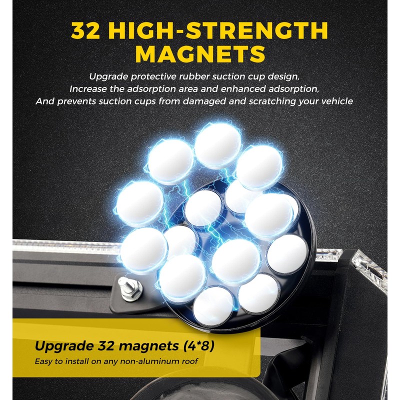 - Easy Installation: Strobe lights are equipped with 32 super powerful magnets and larger, thicker rubber suction cups. They're more stable than 4 x 4 magnets. They can be easily and quickly installed on metal vehicle roofs and have stronger adsorption