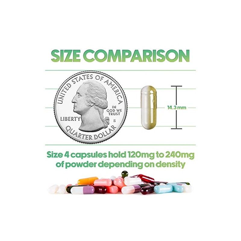 - Fast Capsule Filling - These empty pill capsules come pre-separated to make the capsule filling process quick and simple. Say goodbye to crushed capsules... Our size 4 separated capsules are specially designed to be used with your capsule filling machine. Separated capsules size 4 hold 120mg to 240mg of powdered supplements, depending on density.