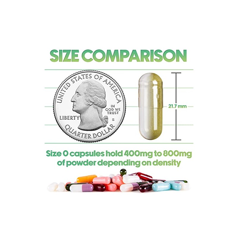 - Easy to Fill - Whether you like to manually fill your caps or use a capsule filling machine capsule maker, or by hand, our size 0 empty gelatin capsules are designed with tough anti-break conisnap rounded ends and are transparent to make precise filling easier than ever. Our large empty capsules size 0 capsules hold 400mg to 800mg of powdered supplements depending on density.