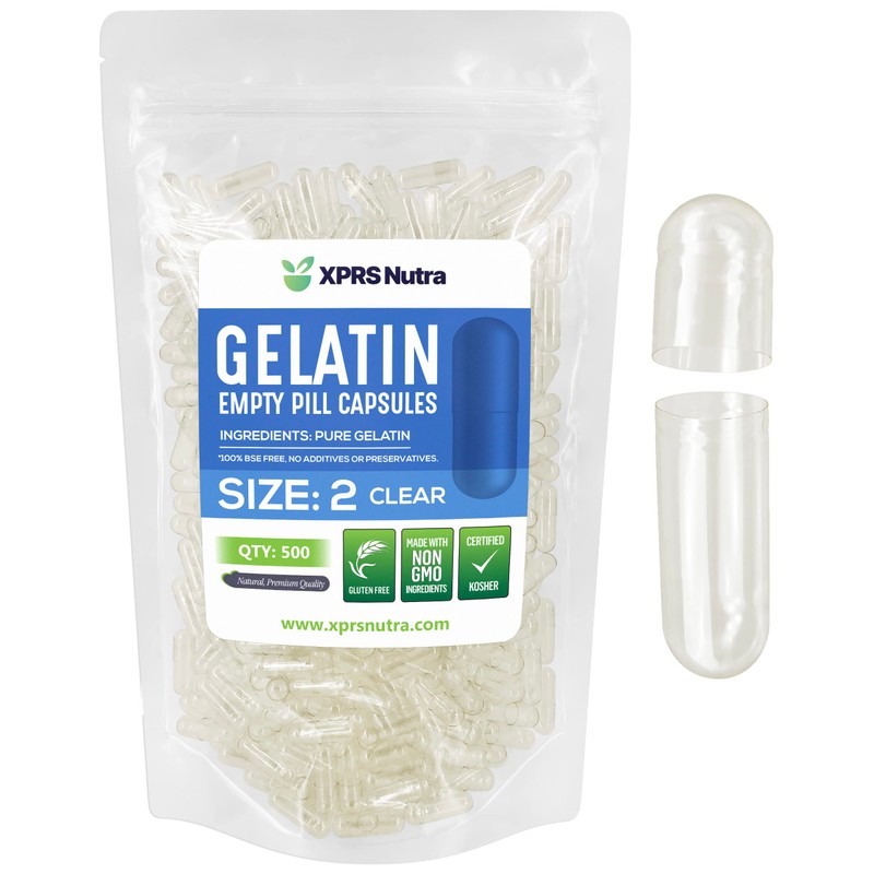 XPRS Nutra Size 2 Empty Capsules - 500 Count Clear Empty Gelatin Capsules - Pills DIY Capsule Filling - Pure Bovine Pill Gel Caps for Do-It-Yourself Supplements