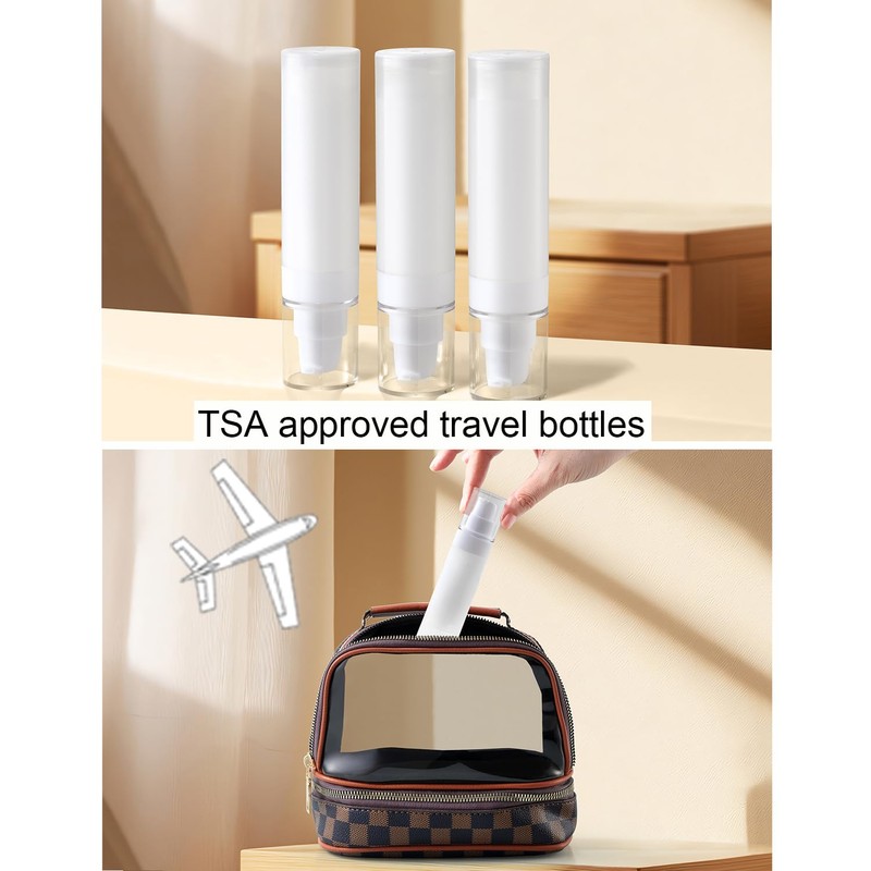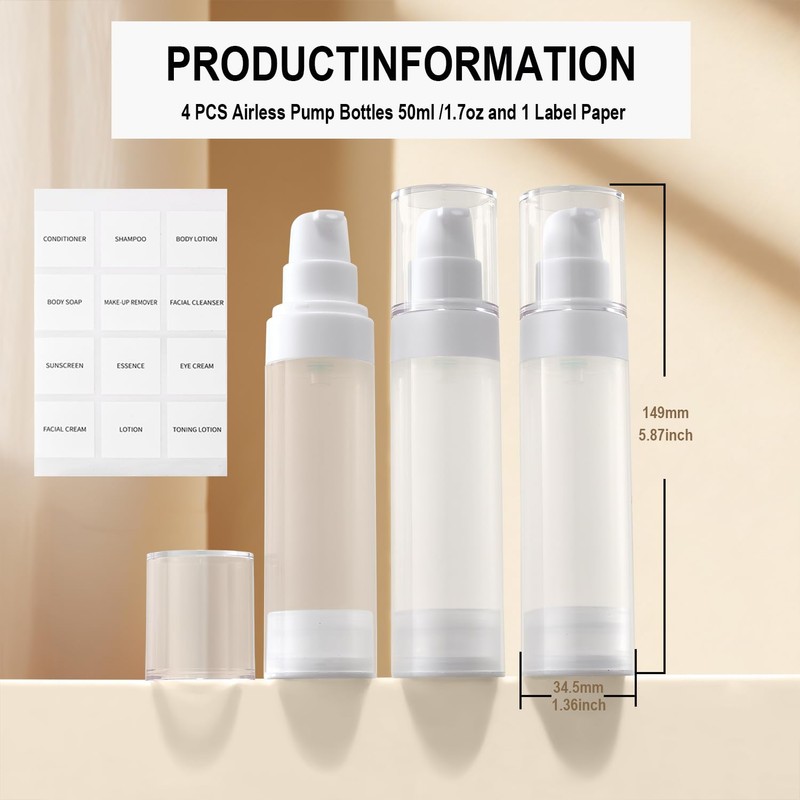 - 【CHARACTERISTIC】 The travel container is a kind of airless vacuum pump bottle in the travel bottle. 50ml (1.7/oz), 34mm in diameter, 149mm in height, 4 bottles) TSA certified size is convenient for you to take a plane and meet your needs when you go out. Pressing it can provide a perfect amount of lotion, which is very suitable for travel