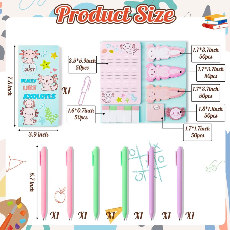 - Gift: Whether you're buying it for yourself or for your friends, classmate, teacher, family, colleague, daily use, birthday, Christmas, Thanksgiving, this axolotl themed sticky notes notebooks and pens set make an excellent gift choice. This stationery set is practical and can be appreciated, believe that they will be happy to receive such a useful gift