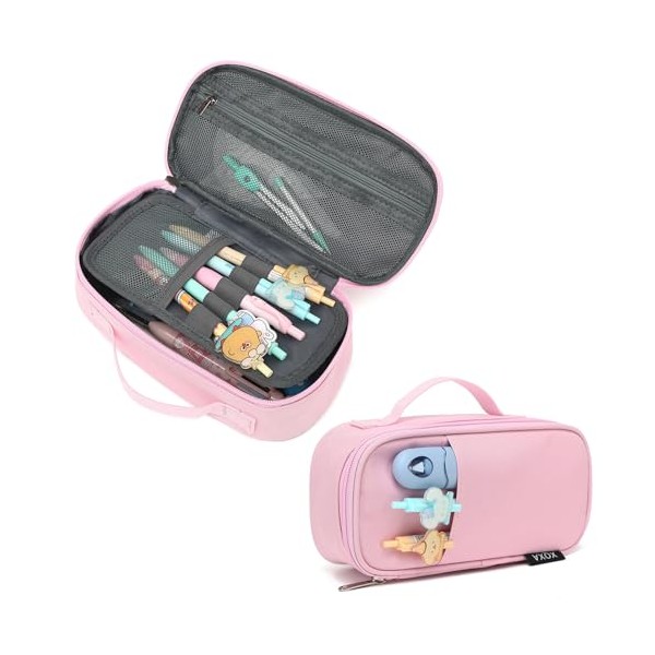 XQXA Large Capacity Pencil Case Multi-Slot Pencil Pouch Durable Pencil Box Portable Makeup Bag with Handle for Office (Pink)