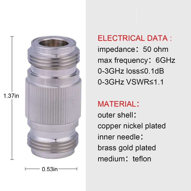 - LOW LOSS LOW SWR--n-female to n-female barrel connector attenuates signal only 0.1dB.6000MHz vswr< 1.15.made of copper.teflon for a reliable signal every time.no measurable swr increase nor signal loss.