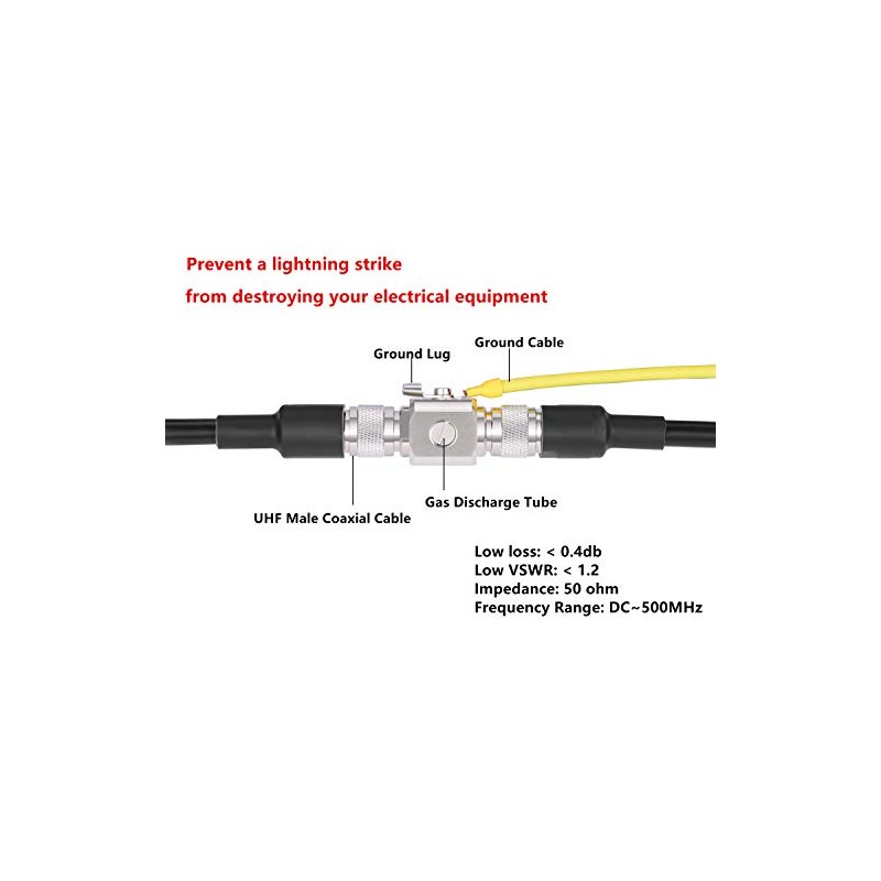 - ⚡Low Loss Low Vswr - 50 Ohm Coaxial Lightning Arrester UHF Type Female to Female, Low RF insertion loss less than 0.4dB. VSWR less than 1.2. Reliable Frequency-Band Performance from DC~500MHz.