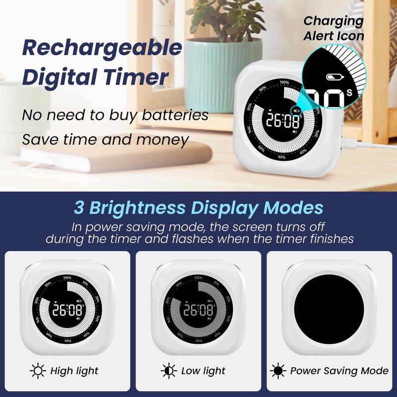 • 2 Brightness Levels & Energy Saving Mode The digital timer provides two brightness levels - high and low - so you can choose the right level according to the lighting conditions in the environment to avoid discomfort or difficulty reading the screen. It also has a power saving mode where the screen turns off during the runtime of the timer and flashes after the timer has elapsed.