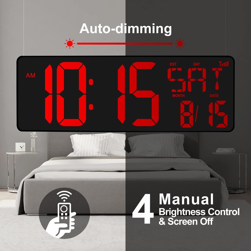 - JUMBO DISPLAY WALL CLOCK WITH AUTO-DIMMING ----- 16.5" extra large LED display with big bold digits make it much easier to read anywhere in the room. This big digital wall clock can show the time, date, month, day and temperature, bring you clear and comfortable visual sense. Auto dimming based on the light levels, no glaring light at night but bright enough to read time.