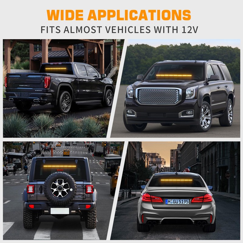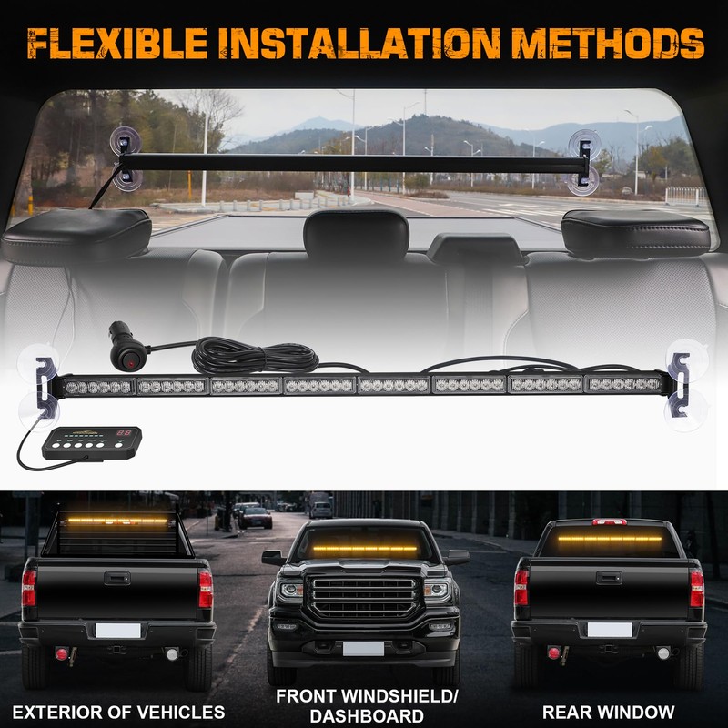 - 【MULTI-PURPOSE USE】This 35" amber light bar is great for emergency vehicles, mail postal service, law enforcement, hazard warning, safety car, snowplow, tow trucks, trailer and tractor etc. Mount on cars interior front / rear windshield, sunvisor, deck and dash etc.. or exterior roof top.