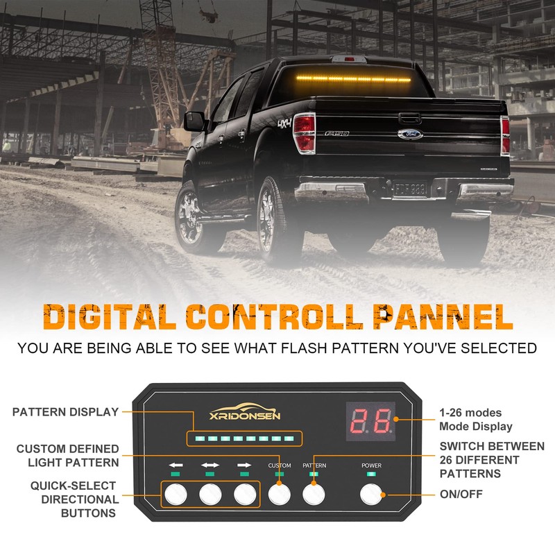 - 【UPGRADED CONTROL PANNEL】Just plug in the 12V cigarette lighter, you can turn on and off, switch modes between 26 different flash patterns and customize the directions of the flashing light with the display controller. It shows what flash pattern you've selected.
