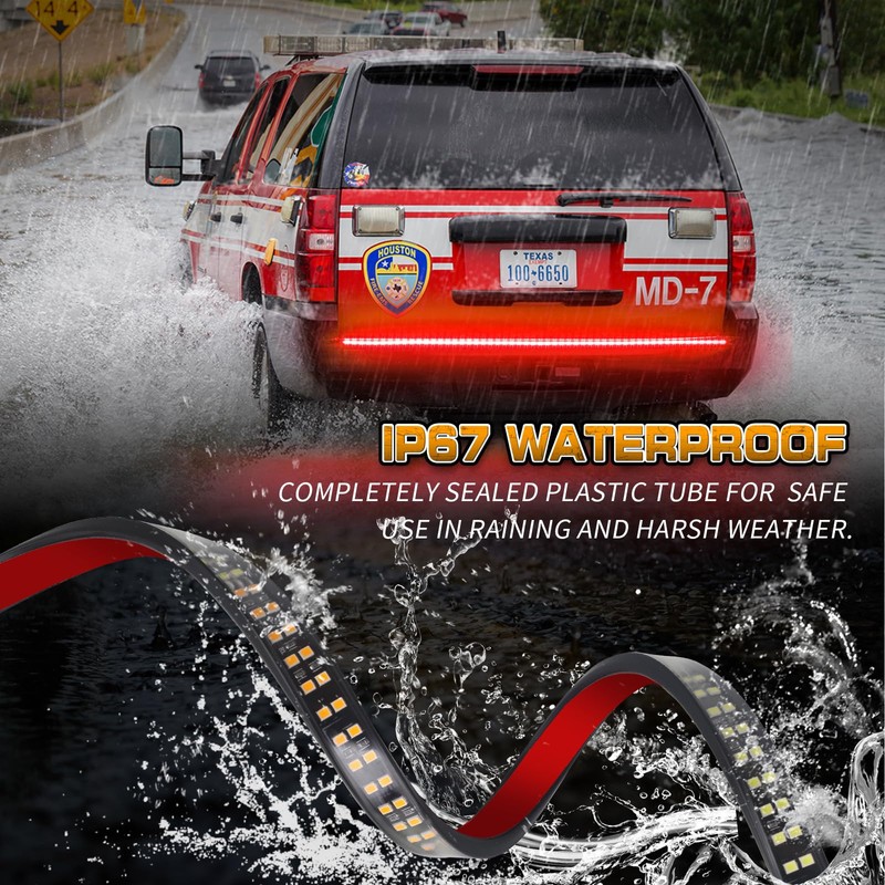 - 【HIGH-QUALITY】This rear emergency lights is well-made, low consumption and IP67 waterproof. The clear PVC tube is completely sealed for safe use in harsh weather. Even driving through lots of rain, highway speeds, potholes, the rear emergency lights strip can still stay on and work great.