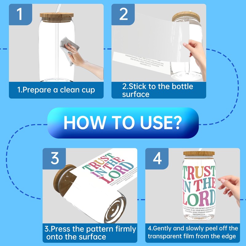 - How to use: Step 1: Select the sticker you want to transfer. Step 2: Tear off the transparent film. Step 3: Stick the transfer sticker to the decorative surface. Step 4: Press firmly and rub the transfer sticker. Step 5: Gently and slowly peel off the transparent paper from the edge. UV DTF cup cover transfer sticker is easy to use, no water required. You can do it easily, saving time and energy