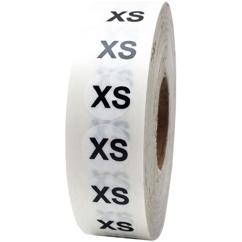 These are some of our most popular size labels because they do not take up much real estate on the folded apparel. They show the initials XS (which is extra small) going down the label 8 times. The shirt size is in black print with a small 1/2" round white circle behind it. This is so sizes can be seen on dark and light garments. The label material is a clear transparent BOPP polypropylene. These size stickers are made with an apparel safe adhesive backing. Easy to peel and apply. Will also stick well to poly bags.