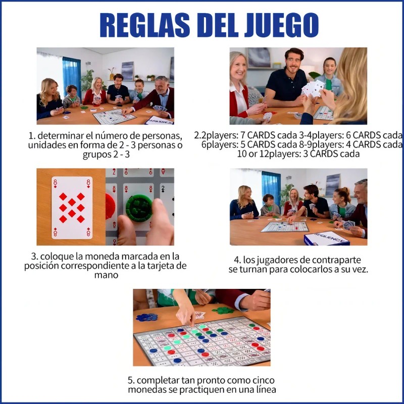 "Sequence" no es un juego de cartas en el sentido tradicional, sino un juego de estrategia que combina elementos de cartas y tablero. Combina las características del póquer y los juegos de mesa para el entretenimiento familiar.