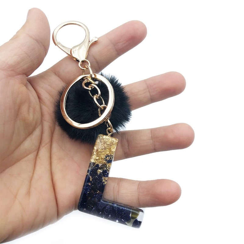 Xsclpomddy Women's Alphabet Letter Key Ring Cute Key Ring Glitter with Pom Pom Tassels Resin Keychain Black for Bag Charm, l