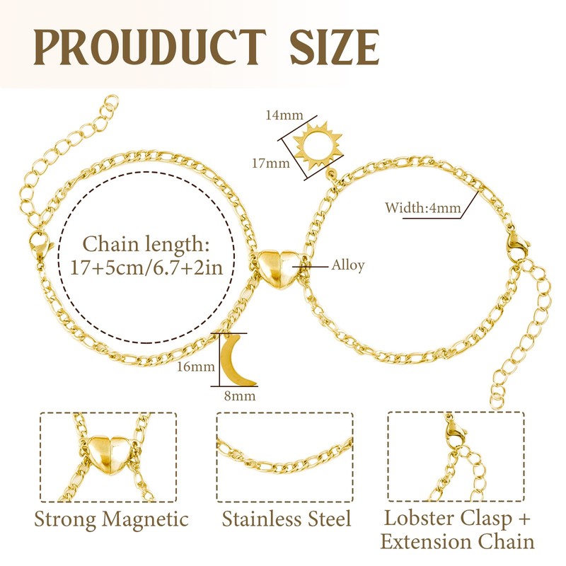 - HIGH QUALITY MATERIAL: The chain, sun and moon pendants in the magnetic couple bracelet are made of stainless steel, the heart is made of high quality alloy, hypoallergenic, lead-free and nickel-free, even if you wear it for a long period of time, it will not have any adverse effects on your body.