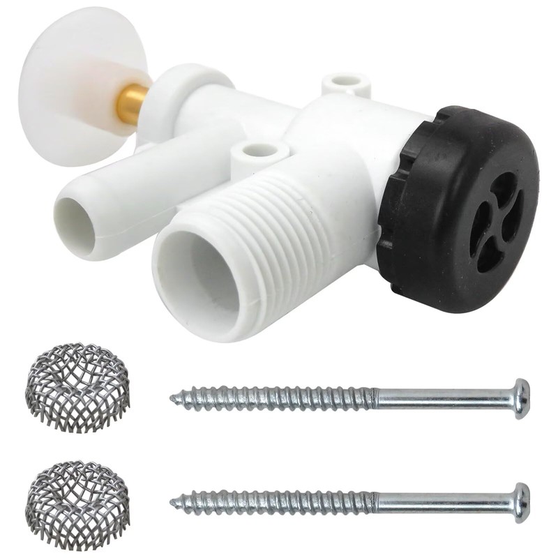 - 【Package included】1x RV toilet water valve, 2x mounting screws, 2x stainless mesh filter