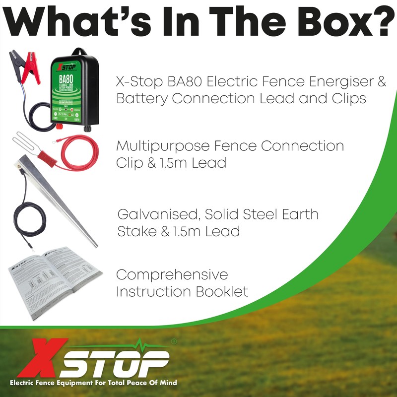 XSTOP 12 Volt Battery Powered Electric Fence Energiser XSTOP BA80 10Km Range, 0.6 Joule Output, Weatherproof Kit Includes Leads and Earth Stake. For Horses and Other Animals