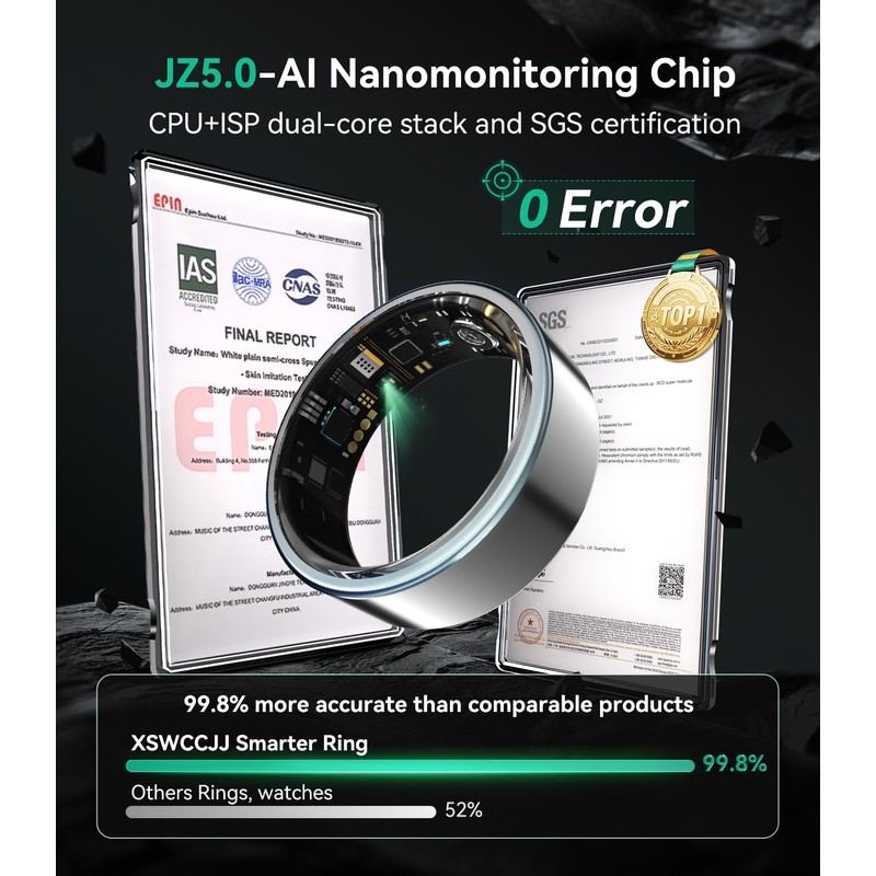 - 🏥【JZ5.0 Chip - Authoritative 0 Error Technology】The Smart Ring Uses the Revolutionary JZ5.0 Chip,With 8 Automatic Exercise Modes (Swimming, Cycling, HIIT) and Sleep Stage Analysis.