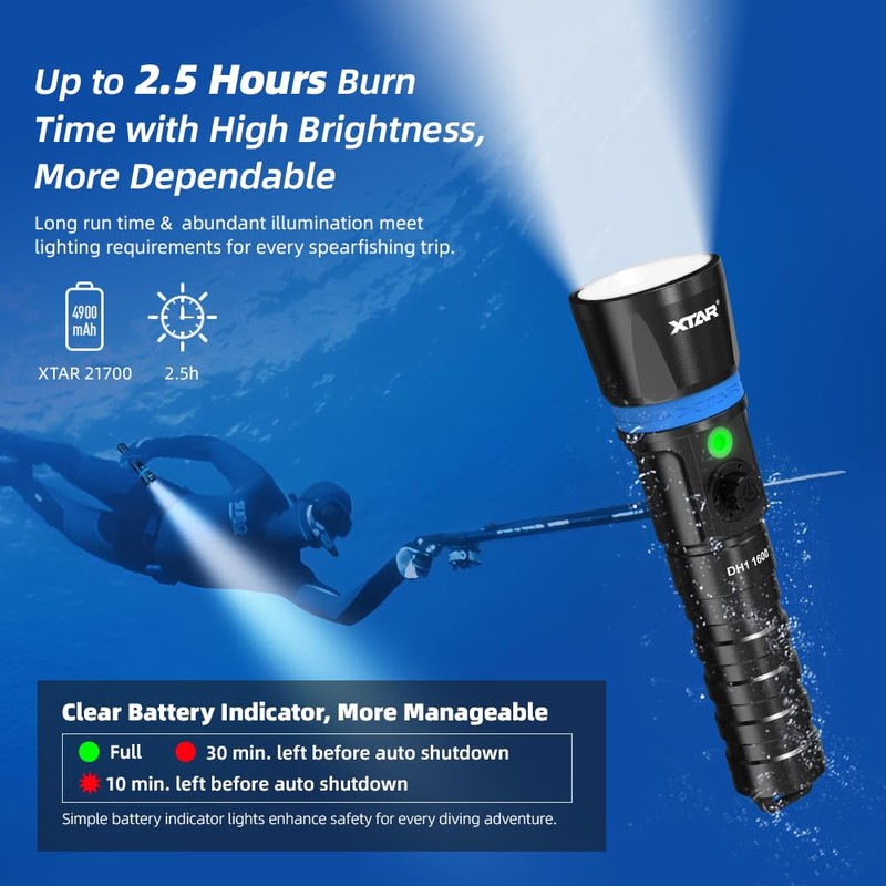 - 2.5 Hours Burn Time:The XTAR DH1 scuba light is powered by 1 pc 4900mAh rechargeable battery, the runtime can last up to 2.5 hrs, allows you enjoy the fun of exploring the fantastic underwater world. It's suitable for scuba diving, spearfishing, underwater rescue, cave exploration, camping, and hiking