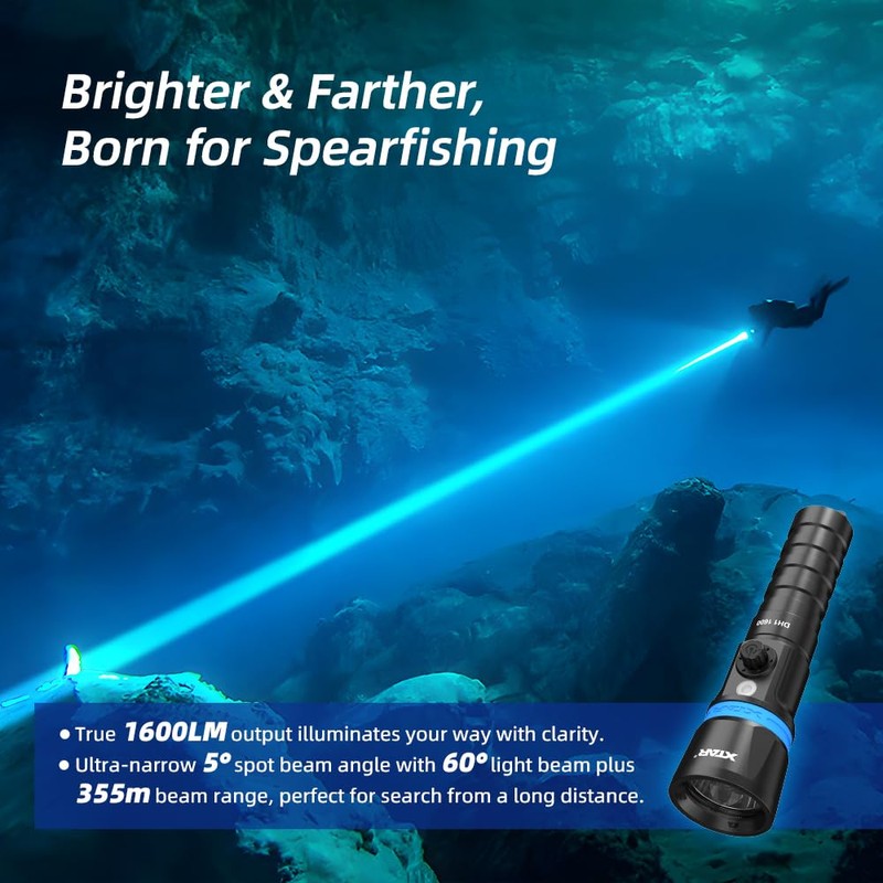 - Max 1600 Lumen Output & 5 Degree Narrow Beam Angle - XTAR DH1 is a super bright dive light with 1600 lumen output,makes you feel to bring daylight into deep dark underwater. 5 degree narrow beam angle provides you a super bright spotlight and longer beam distance(355meters), you can explore narrow crevices underwater easily