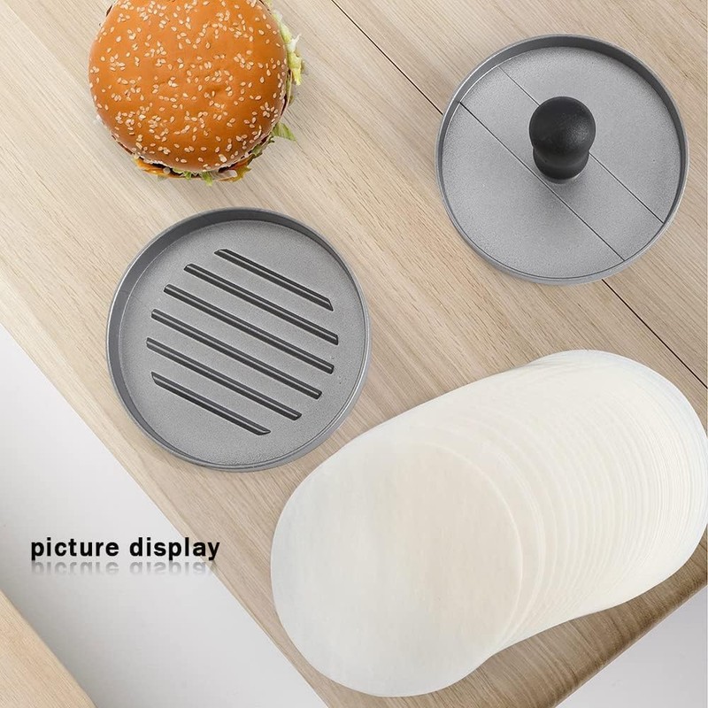 - Hamburger Tool The burger pie maker guarantees perfectly shaped burgers with grooves. The perfect thickness of the hamburger can be adjusted in a few seconds, with a professional burger look. FREE BONUS 100 pieces of round baking paper are included to prevent burgers from sticking together and keeping them intact when removed so that the hamburger can be easily removed from the press.