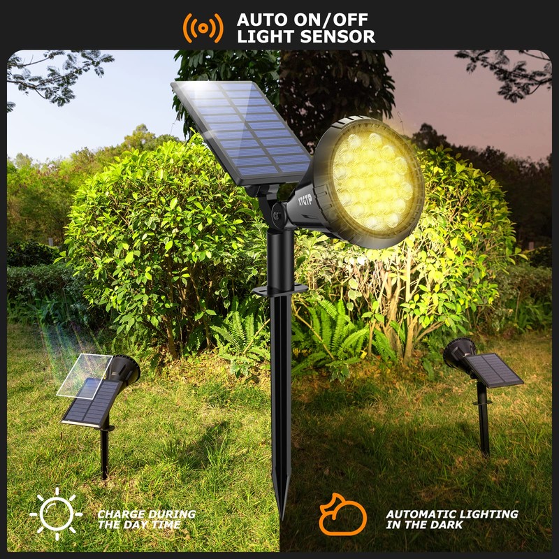 - ☀️【3 Brightness Lighting Modes】The outdoor solar spot lights have 3 lighting modes to meet your different needs. Press the power button and switch the modes between Low Light Mode/Medium Light Mode/High-Light Mode (18-12-6Hrs using time), dusk to dawn; with the light sensor, the solar light can automatically charge in the daytime and light up when it gets dark, no need to turn it on manually, please place the solar garden lights in direct sunlight to ensure sufficient power.