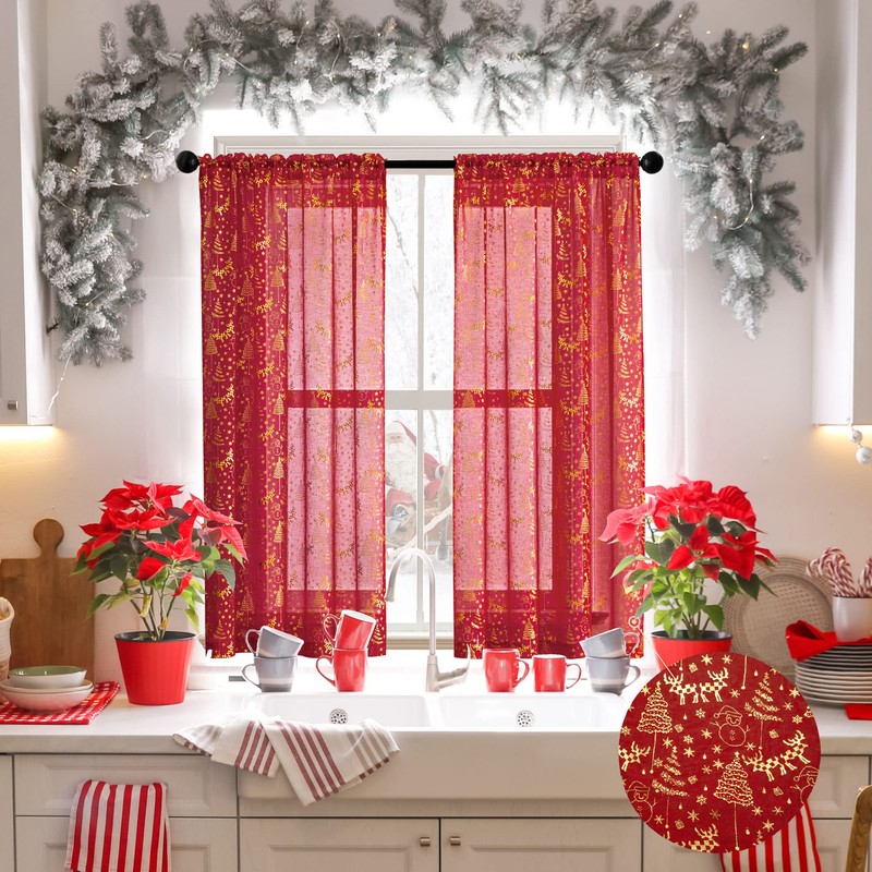XTMYI Christmas Kitchen Curtains 45 Inch Length,Red Sheer Short Curtains for Windows,Cortinas De Navidad para Cocina