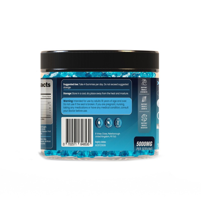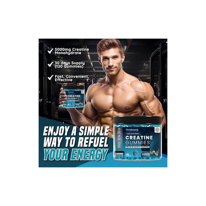 Product description XtraBoost Creatine Gummies – Clean Strength. Real Results. Fuel your workouts and elevate your performance with XtraBoost Creatine Gummies — the powerful, convenient, and delicious way to support muscle growth, endurance, and recovery. Each serving of XtraBoost delivers a clinical-strength 5000mg of Creatine Monohydrate, the most researched and bioavailable form of creatine, trusted by athletes around the world. Whether you're lifting, sprinting, or grinding through HIIT, this pre-workout formula is designed to help you push harder, recover faster, and perform at your best — every single day. But XtraBoost doesn't stop at creatine. We've added key performance enhancers like Vitamin B12 and L-Taurine, making this a complete energy and recovery supplement in a tasty, blueberry-flavoured gummy format. Why XtraBoost Creatine Gummies? Max-Dose Creatine (5000mg) – Promotes muscle strength, power, and improved endurance. Pre-Workout Support – Ideal for boosting performance without the mess of powders or the need for water. Vegan & Delicious – Naturally flavoured, chewable gummies with no artificial colours or animal gelatin. Enhanced with B12 & L-Taurine – Supports energy metabolism, nerve health, cardiovascular function, and focus. 30-Day Supply – 120 gummies per bottle, with a simple 4-gummy daily dose. Whether you're a gym beginner or an advanced lifter, XtraBoost Creatine Gummies help bridge the gap between effort and progress. No more mixing, no more mess — just clean, effective strength support in a gummy that fits your lifestyle.IngredientsPurified Water, Organic Cane Sugar, Organic Tapioca Syrup, Malt Syrup, Pectin, Citric Acid, Coconut Oil & Carnauba Wax. Natural Blueberry Flavour, Fruit and Vegetable Juice (for colour), Sodium Citrate. Creatine Monohydratem L-Taurine, Vitamin B12 (as Methylcobalamin)DirectionsTake 4 Creatine gummies per day for a 5000mg serving of Creatine MonohydrateSafety WarningThis product is intended for adults aged 18 and over. Do not use if the safety seal is broken or missing. If you are pregnant, breastfeeding, taking medication, or have a medical condition, please consult your healthcare professional before use.