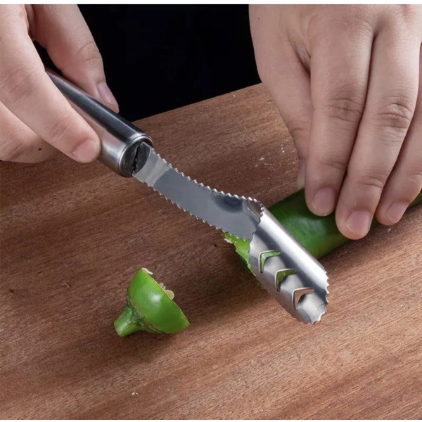 • The pepper core remover allows you to quickly remove the pepper seeds and get a complete pepper shell. It is an essential tool for home kitchens or barbecues and a boon for pepper lovers.