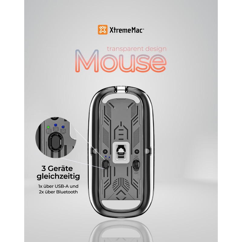• Innovatives Design und Komfort: Unser transparentes, ergonomisches Design kombiniert mit einer leisen Klick-Technologie bietet Komfort für lange Nutzungsdauern und ist geeignet für Rechts- und Linkshänder. Die magnetische Mausabdeckung sorgt für eine einfache Handhabung und einen sicheren Verschluss.
