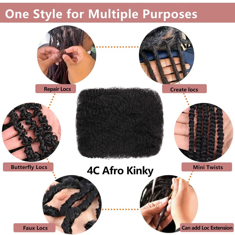 - 【Variable Hairstyle】Afro Kinkys Bulk Human Hair is ideal for making marvelous extensions, You can use your imagination to make your own Dreadlocks Extensions Repair Locs with Afro Kinkys Bulk Human Hair,and can also be used for Twist Braiding, Mini Twists, Butterfly Locs Crochet Hair, Distressed Locs, Mini Senegalese Twist Hair, Micro Twist Crochet Hair, Mini Passion Twist Hair and more,This hair is suitable for women and manof all ages, for daily use and any time you like to look glamorous.