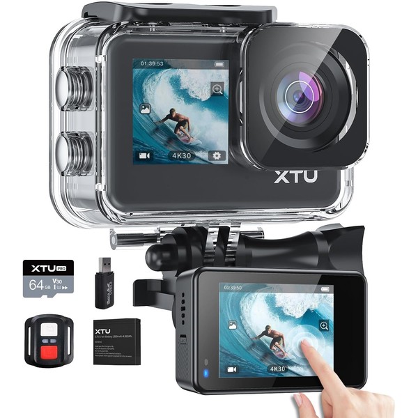 XTU Action Cam 4K30FPS 20MP Ultra HD 2.0 Inch LCD Touchscreen 40M Underwater Camera with 64GB U3 Memory Card, Ice Stabilisation Action Camera, 170° Wide Angle, Remote Control and Accessory Kit