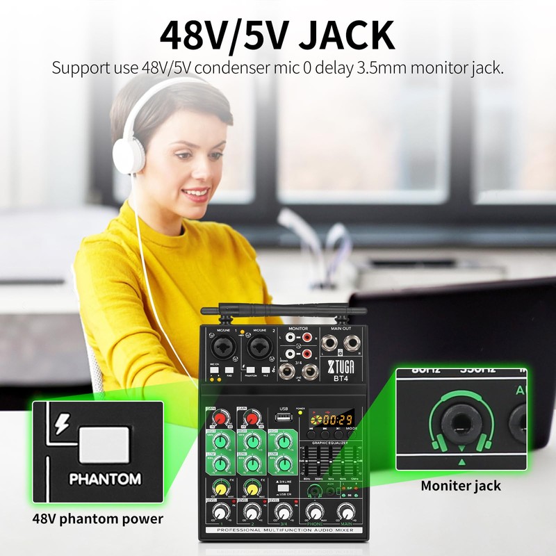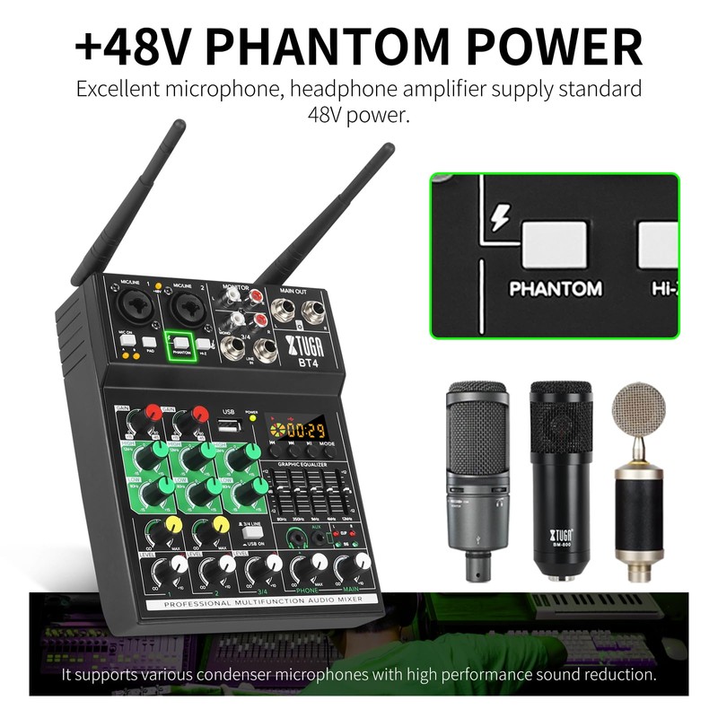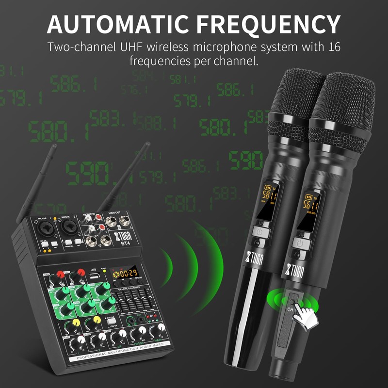 XTUGA BT4 Karaoke Mixer with Wireless Microphone, 4 Channel Audio Mixer With Dual Wireless Mic, Sound Board Console MP3 Bluetooth 48V Phantom Power USB Audio Interface DJ Mixing for Home…
