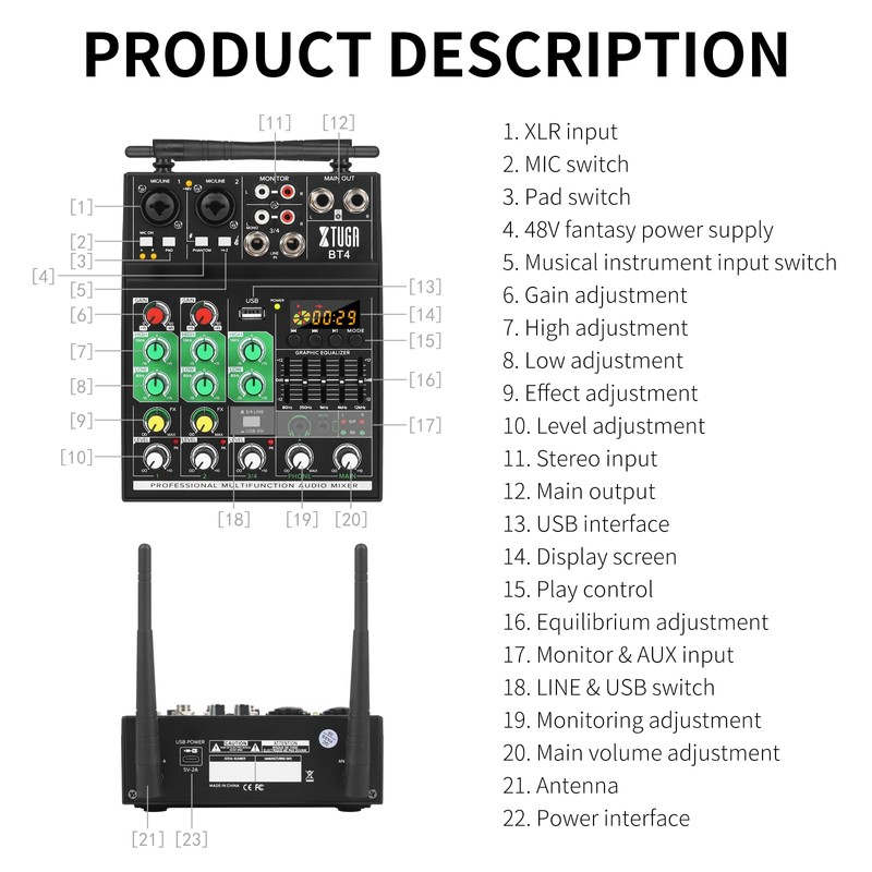 - Packing list: 1*BT4 Mixer, 2*Handheld Microphone, 1*Power cable, 1*5V2A Power Plug,1*USB to USB cable, 2*Mic Protection Ring, 1*Manual. Note: Each microphone requires 2*AA batteries (not included)