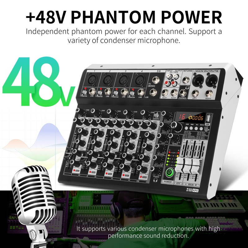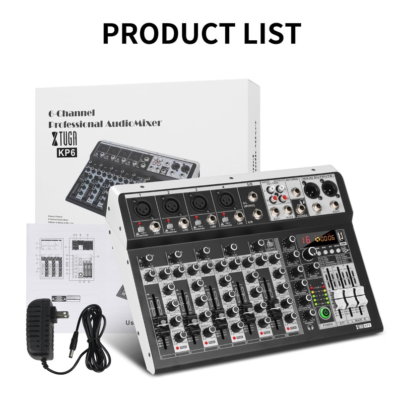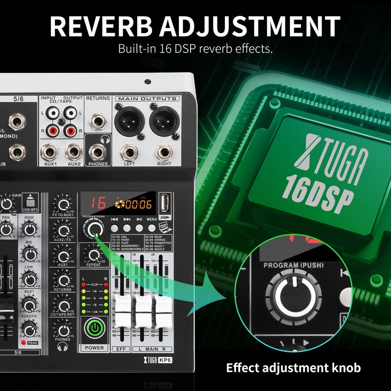 XTUGA KP6 6 Channel Audio Mixer, 16-Bit DSP Effect USB Audio Interface Effects +48V Phantom Bluetooth for Home Studio Recording Live Streaming Recording Equipment