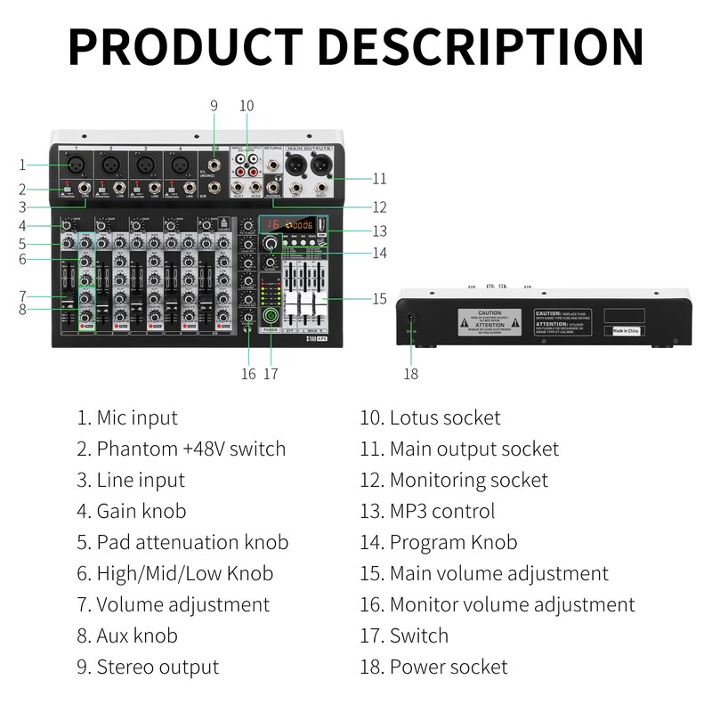 - Powerful Function: This sound mixer is equipped with a 16-bit digital stereo effects processor, which can provide 16 different kinds of echo effects, including room and hall. You can adjust the echo time and feedback to meet different needs. This mixer also supports phantom power for condenser microphones.