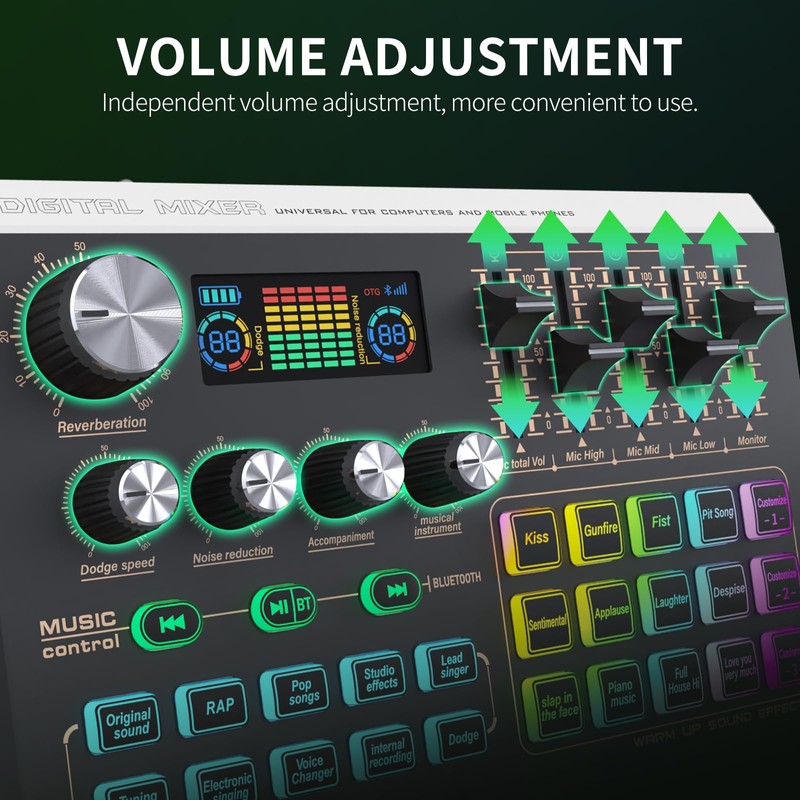 - Enjoy precise control over each channel with the streaming audio mixer, enhancing your streaming experience with smooth volume slider faders. 4 independent channels on the DJ mixer provide individual volume control for microphone, LINE IN, headset, and OTG. Easily configurable via the audio mixer for streaming, rather than solely relying on your gaming or streaming software